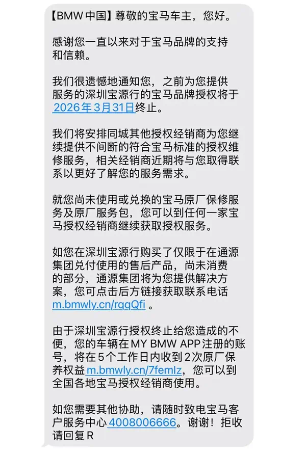 更让深沪两地车主揪心的是,宝马厂家的回应始终避重就轻,并未真正解决核心问题。深圳车主陆续收到BMW中国发送的短信通知,明确告知宝源行的宝马品牌授权将于2026年3月31日终止。