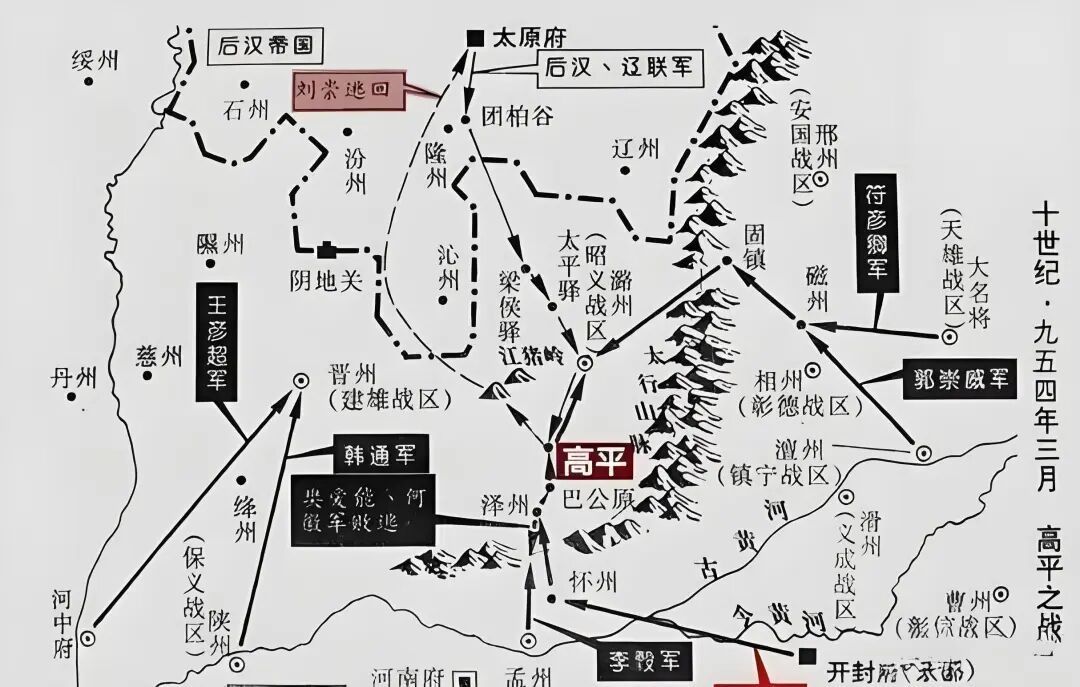 郭威起兵复仇,灭了后汉政权之后,刘知远的弟弟刘崇在山西太原一带建立北汉政权。同时,刘崇认契丹为叔皇帝,自己为侄皇帝,借此获得契丹的支持重新复盘。
